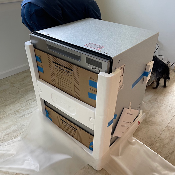 Here is Bruce unboxing the dishwasher while Nox watches.