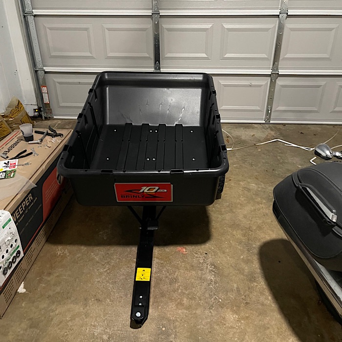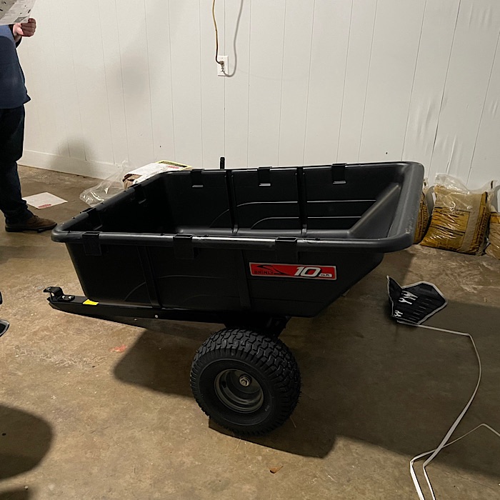 This cart is to pull behind the lawnmower. We wanted a light weight plastic cart to give us more towing capacity with the mower. The metal carts are so heavy that we wouldn’t be able to carry as much.