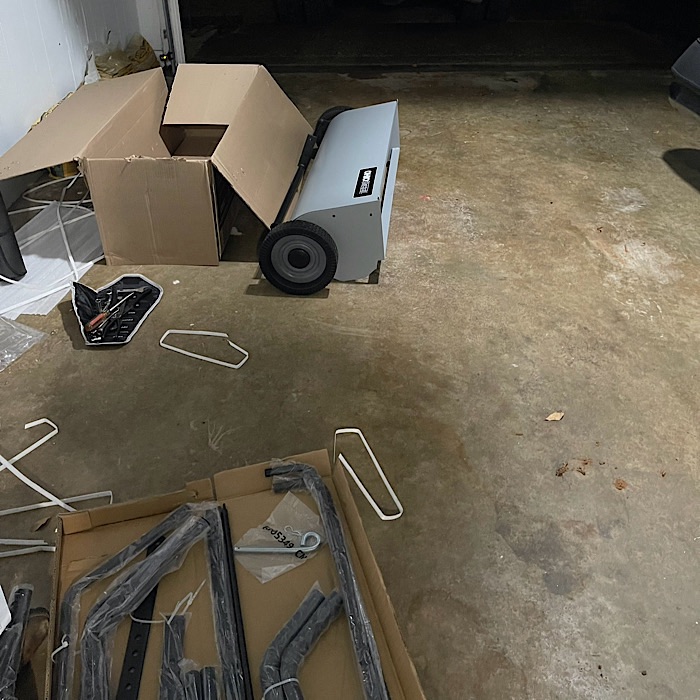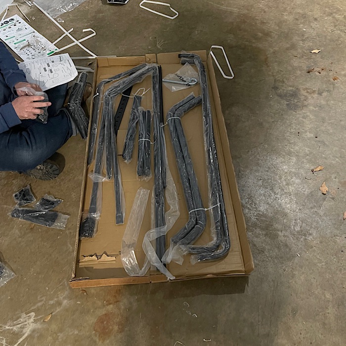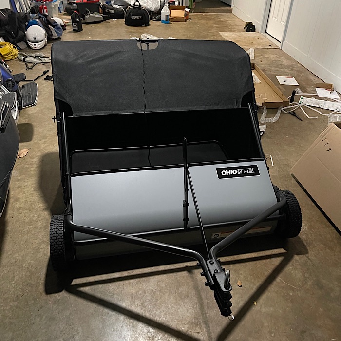 We ordered a leaf sweeper to tow behind the mower from Amazon. It arrived yesterday and we spent this evening putting it together.