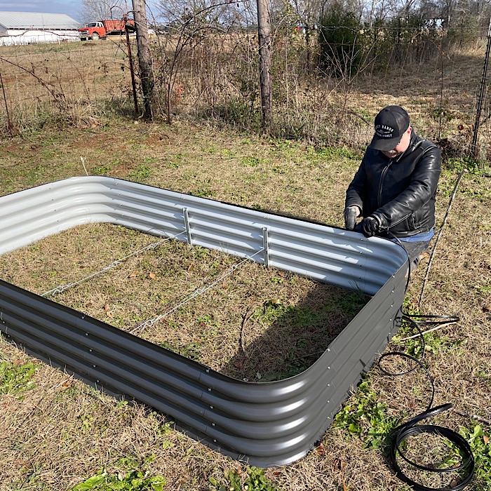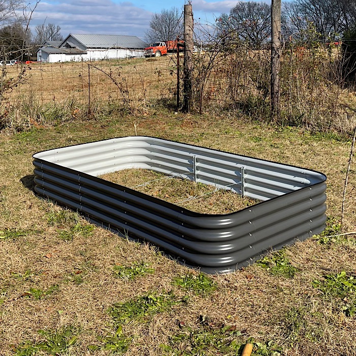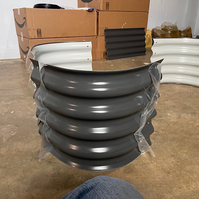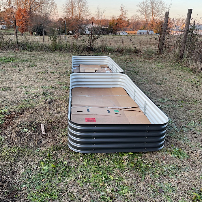 Yesterday, the boxes for the short beds arrived from Amazon. We bought Birdies metal garden beds from Epic Gardening’s store on Amazon. The short garden beds are 15” tall. The beds are configurable and we are putting them together in the 4’ x 8’ configuration.