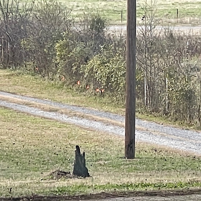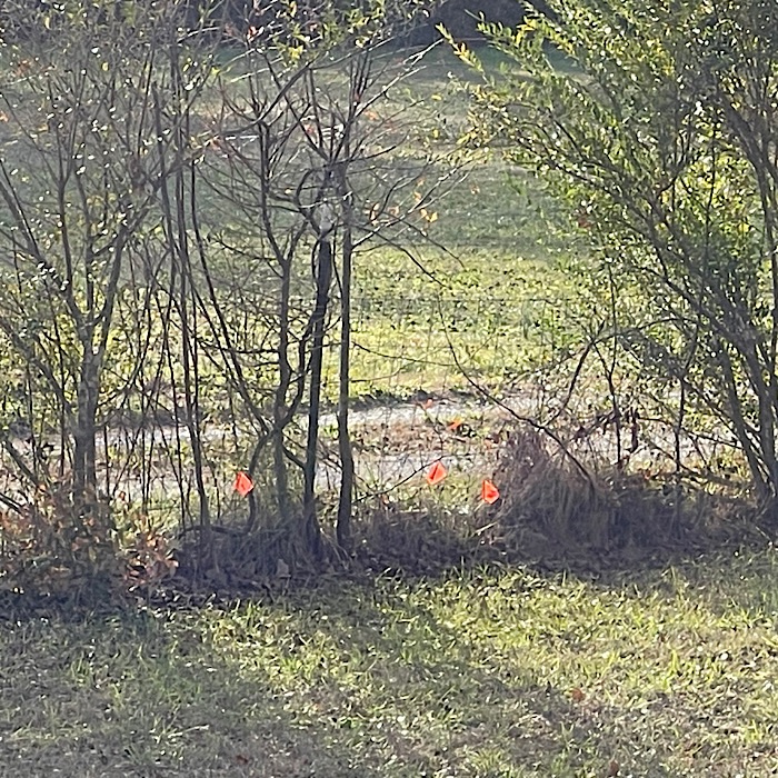 Bruce had the idea to purchase two colors of small flags, one to flag poison ivy and the other to flag plants I want to keep. I picked the bright orange to flag poison ivy. I went around the yard yesterday and today flagging poison ivy. Here are a few pictures of some of the flags.