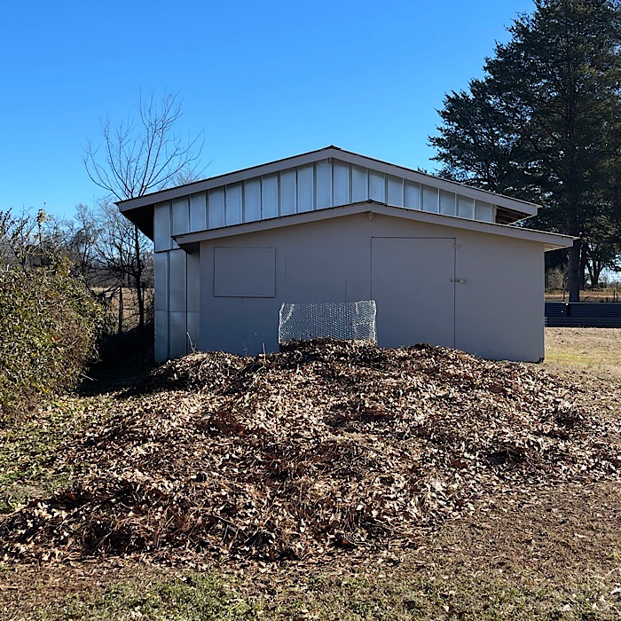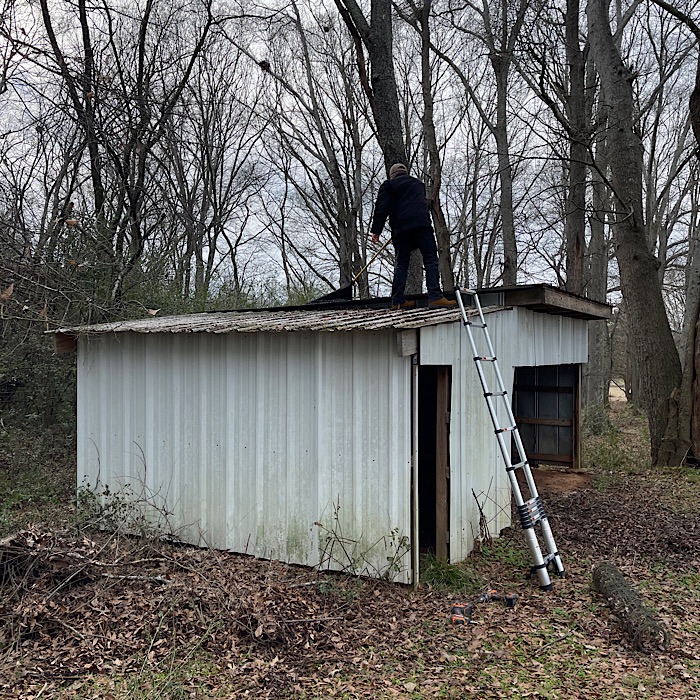 While Bruce had the tools out, he decided to inspect the roof on the other shed. We have rafter that is partially rotten in the other shed. The roof was piled with leaves and branches. Bruce asked me to get a leaf rake so he could clean off all the debris from the roof.