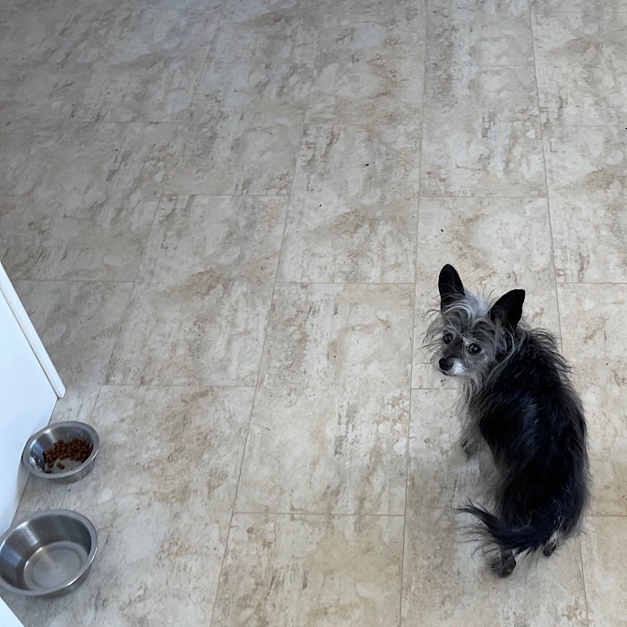 Nox, seeing us heading to the door, was desperate to come with us. I got her bed and put it on her seat in the truck. I then went to put Nox in the truck, but I didn’t see her right off. I looked around for Nox; she was at Bruce’s feet while he was about to step up into the truck.