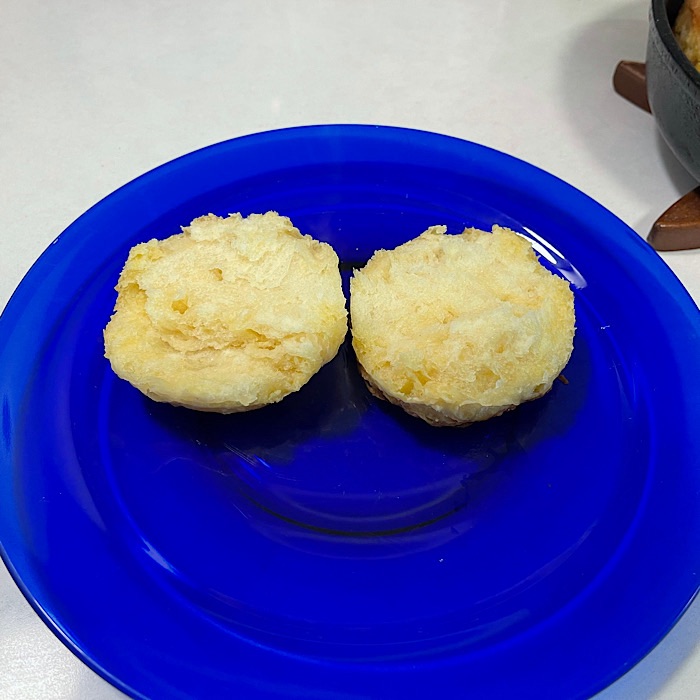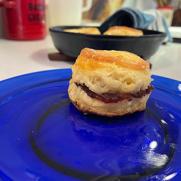 When cooking the frozen biscuits, be sure and preheat the oven. It takes slightly longer to bake the frozen biscuits, but they bake up light and fluffy, with layers. The biscuits in the pictures below were frozen. They were also rolled from the scraps, so they didn’t all bake up straight.