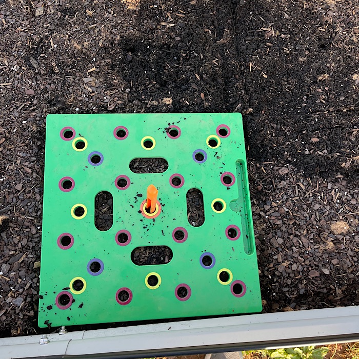 The square of green plastic has holes that are the correct width for planting seeds and plants using the square foot method. The orange plastic stick next to the green square fits into the holes and allows me to poke holes for seeds. It also allows me to mark spaces.