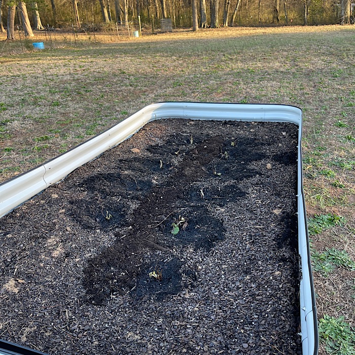 After I finished planting the strawberries, I planted onion plants we brought at Rural King on March 5 in various beds. I had left them soaking in a bucket of water overnight. I planted 5 onions per square. After planting the onions, I watered them in.