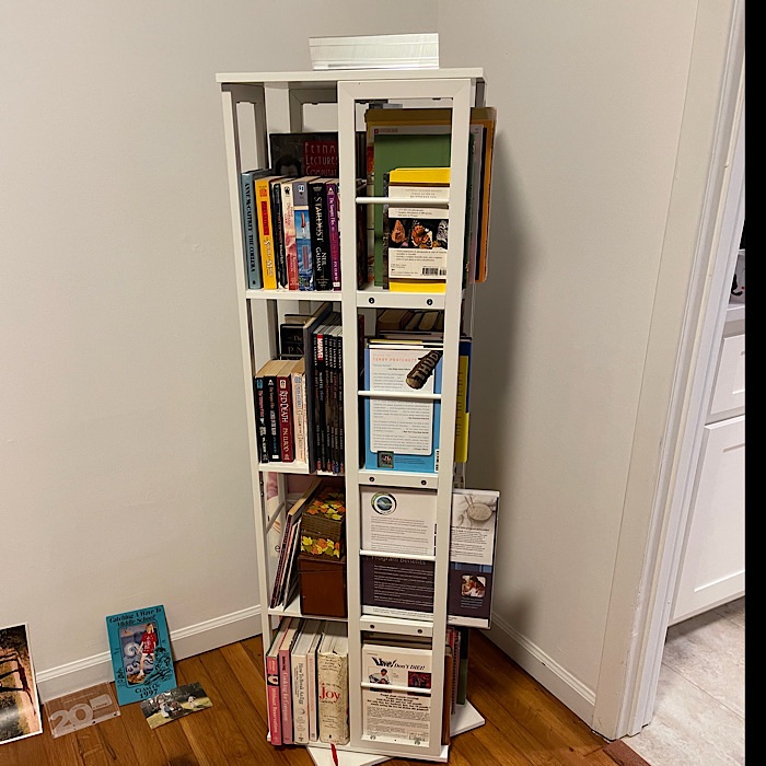 We saved more books than I realized. After filling up the bookcase, I made a couple of stacks of books on the floor. I am considering getting another one of these spinning bookcases.