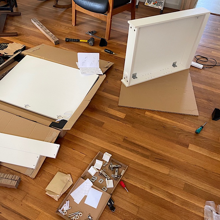 Around 2:30 PM, I decided to start putting together the new medicine cabinet. Bruce had me look at the instructions (It was a picture book, since there was no text.) while he got the tools the instructions showed pictured.