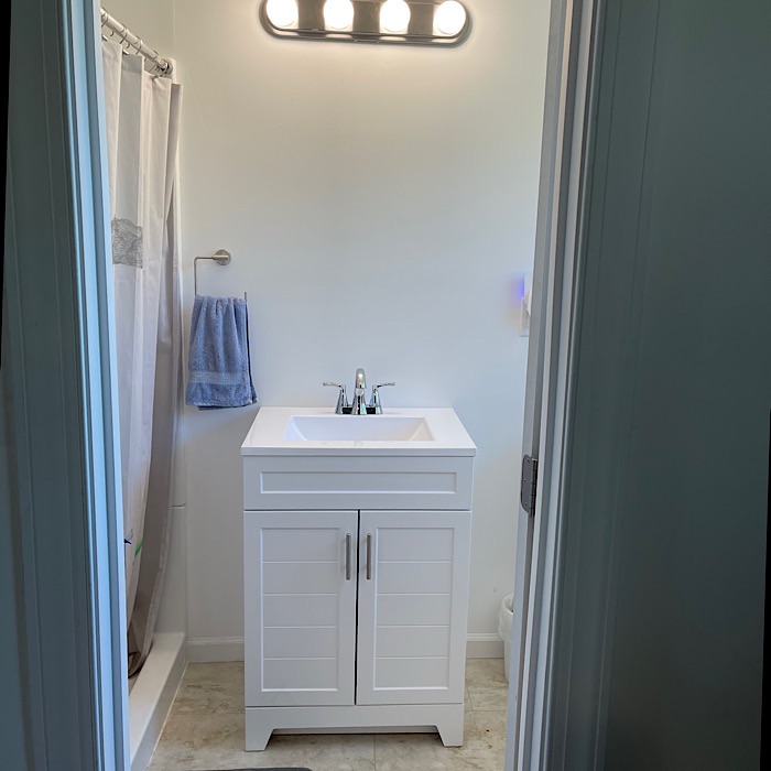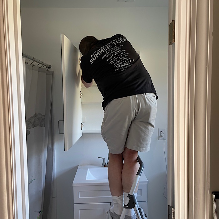 It took almost three hours to get the medicine cabinet put together, hung and connected to the electric switch. We aren’t done with the project yet, as we still have an open electrical box that needs to be covered properly. The hole in the wallboard cut for the old over the sink lights, needs to be patched.