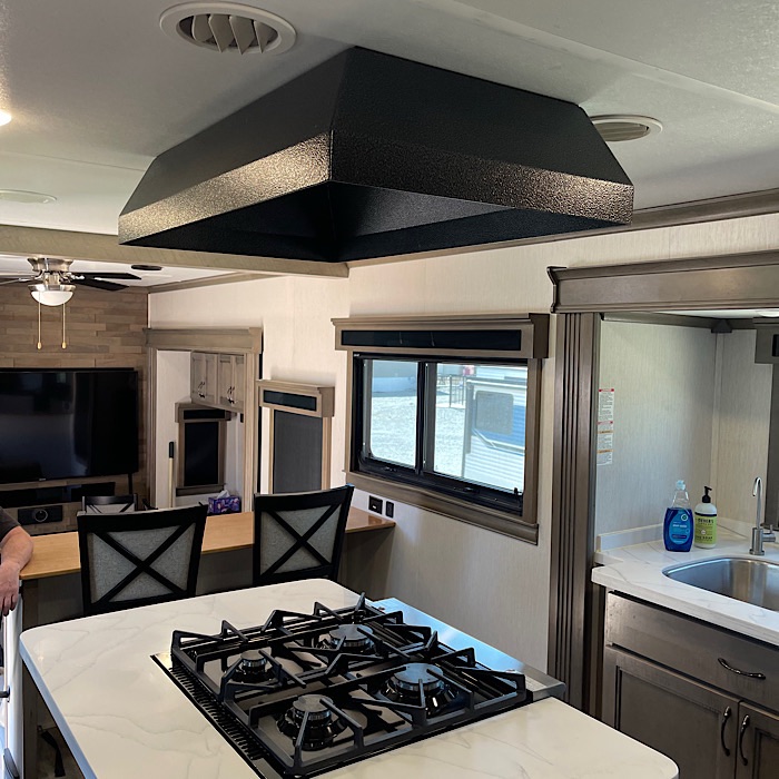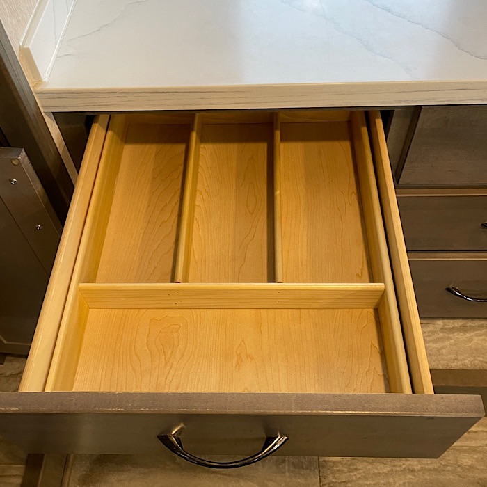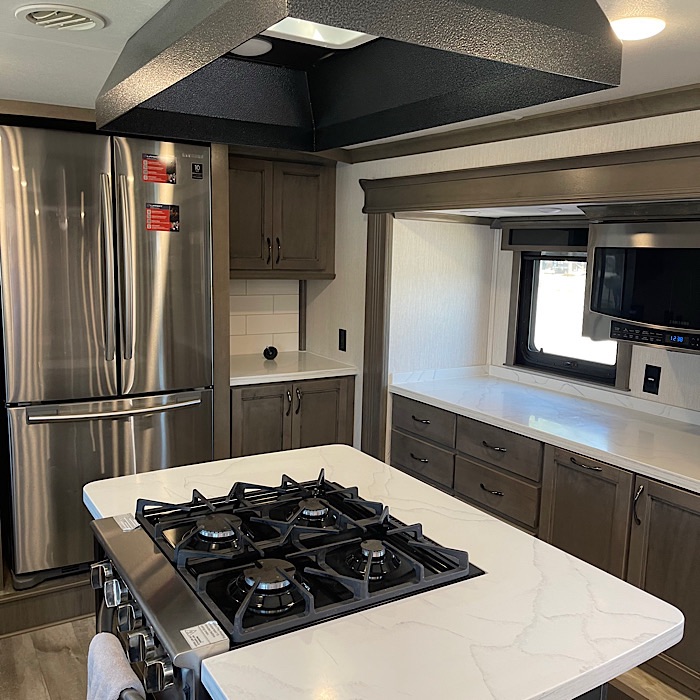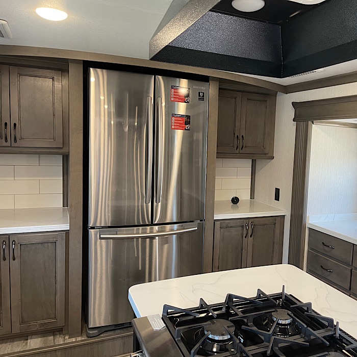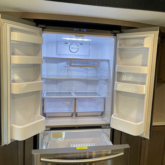 The front kitchen is the largest non-custom RV kitchen made and has 2 slides. It comes equipped with a Samsung residential French door refrigerator, a convection oven microwave and a Fisher & Paykel dishwasher. The counter tops are white solid surface and it has large stainless steel sinks with a residential faucet. The sink covers are cutting boards. The 3.7 cubic feet oven is roomy enough to put a 1/2 sheet pan inside for baking. The stove top has 4 burners. The hood over the stove uses a MaxxAir Maxxfan Deluxe fan to vent the kitchen. There is storage beside the oven for pans and spices. There is storage space for pots, pans, dishes and silverware. The trash can is stored in a cabinet pullout. The breakfast bar (dining bar) in the kitchen overlooks the living room and provides excellent TV viewing.