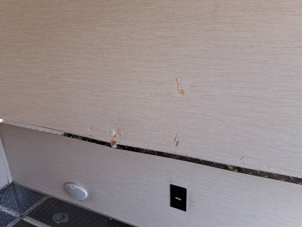 * two exterior trim pieces, from the underside at the rear, are off, one missing.