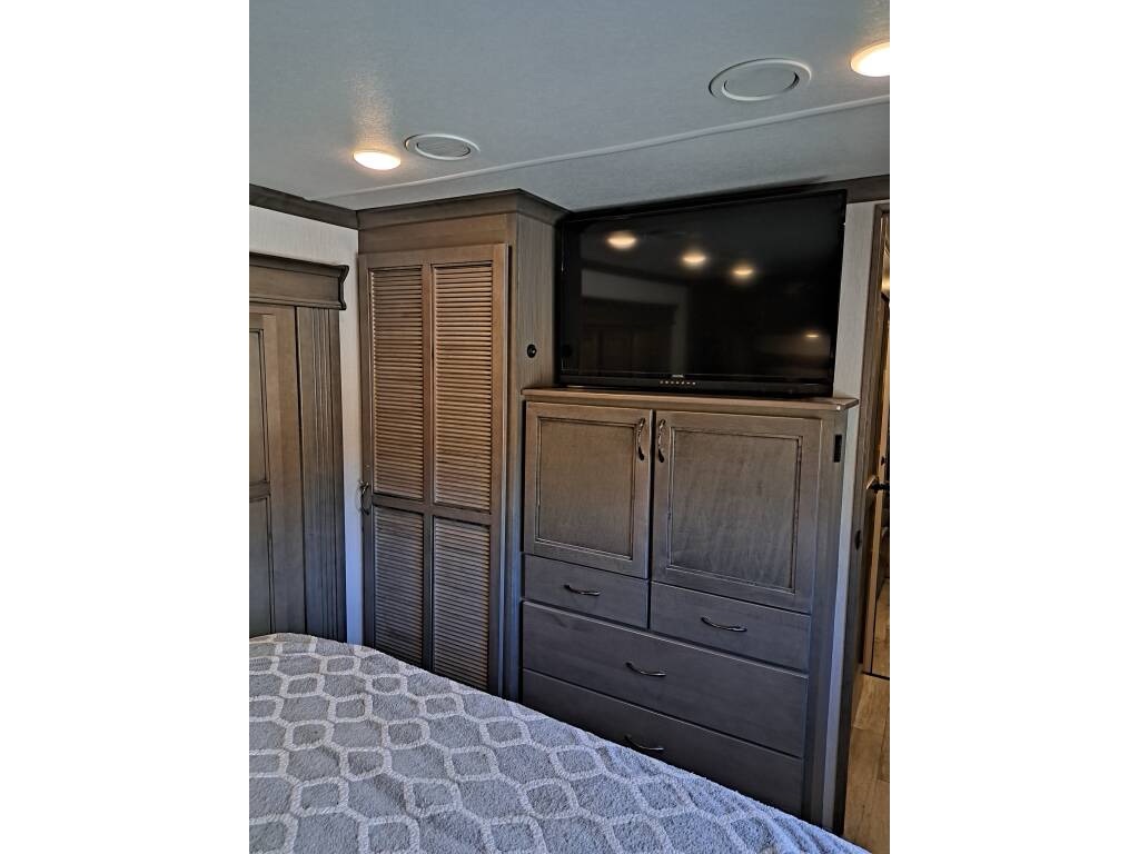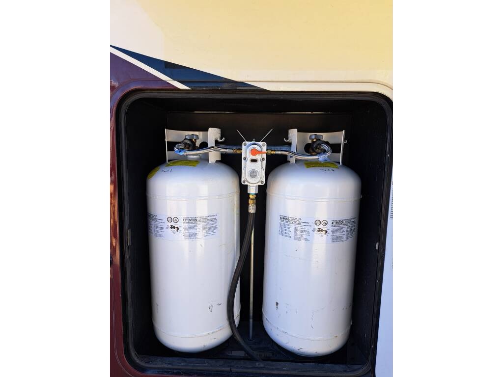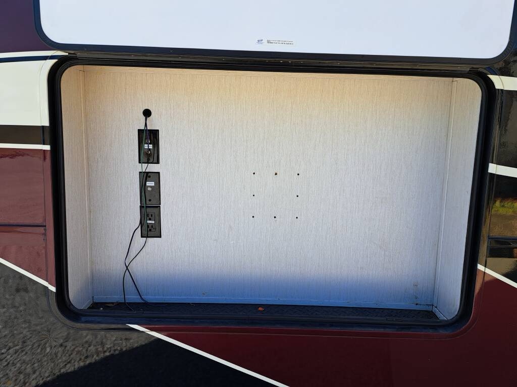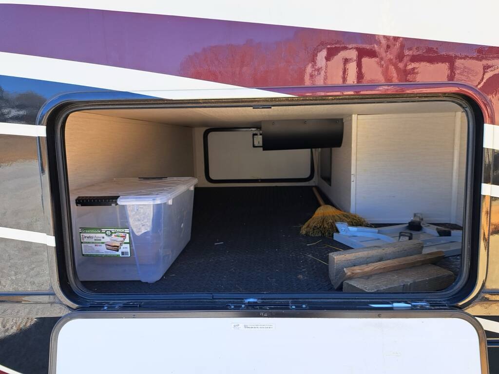 The RV comes with a water manifold system to allow each water line to be shut off, dual 40 lb propane tanks with a propane monitor, 2 heated pass through storage areas, as well as the mini-garage under the bed. The garage roof (bottom of the bed) can be raised to accommodate taller toys. There are shallow storage compartments on each side of the garage. The garage door is zero gravity and is very easy to lift. There is a space (with hookups) for an outdoor TV.