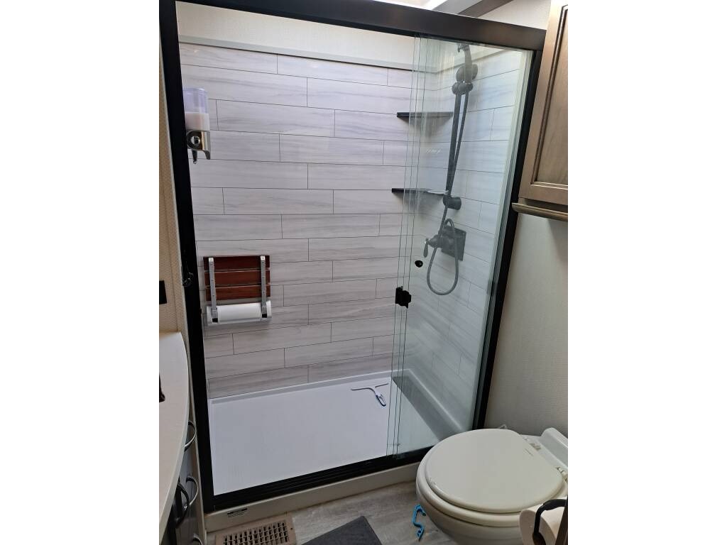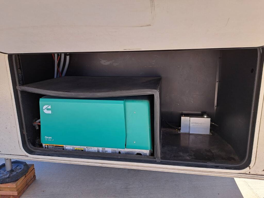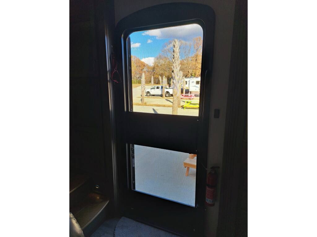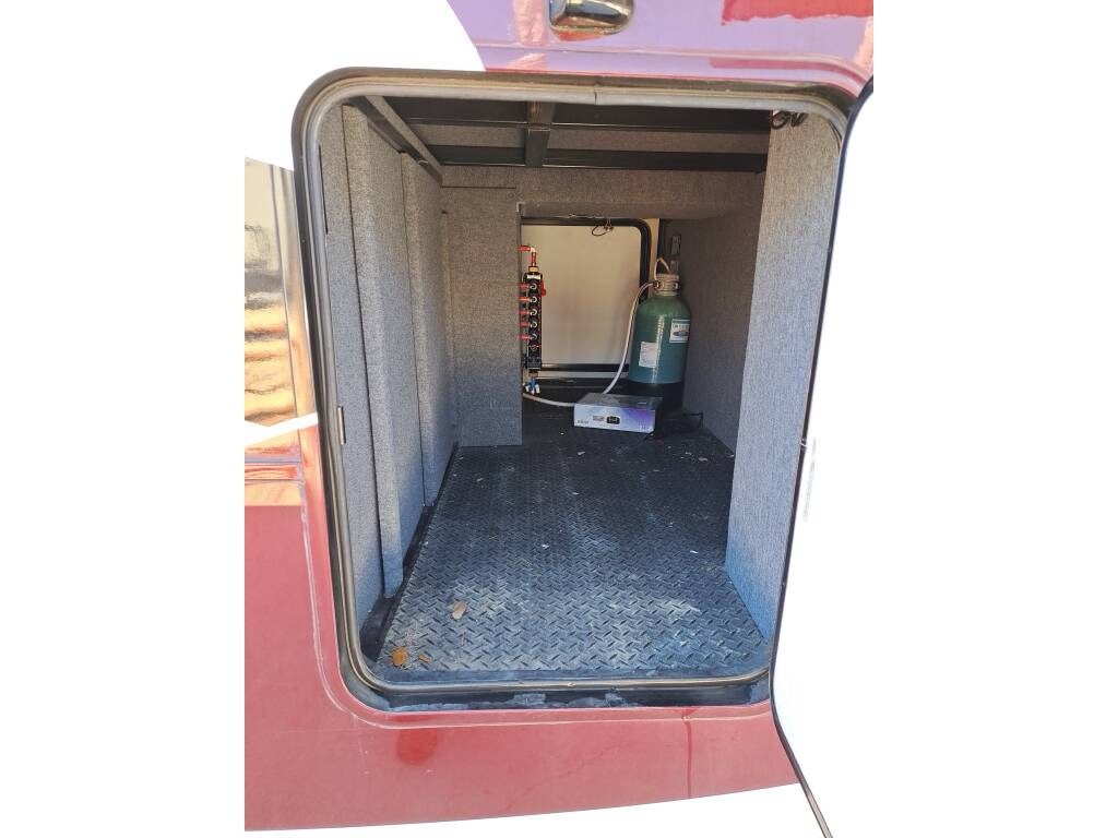 The RV comes with a water manifold system to allow each water line to be shut off, dual 40 lb propane tanks with a propane monitor, 2 heated pass through storage areas, as well as the mini-garage under the bed. The garage roof (bottom of the bed) can be raised to accommodate taller toys. There are shallow storage compartments on each side of the garage. The garage door is zero gravity and is very easy to lift. There is a space (with hookups) for an outdoor TV.