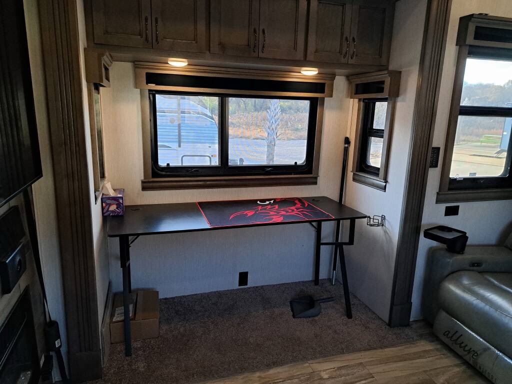 The 42FSKG floorplan is spacious and well-designed with 5 slides. The light grey interior features premium materials and finishes, creating a bright and inviting atmosphere. The central living area includes opposing slides, theater seating, a large 65 flat-screen TV, and a fireplace for cozy nights on the road. It has a built in desk with drawers in one slide and a gaming computer desk in the other slide. There are overhead storage bins in both slides.