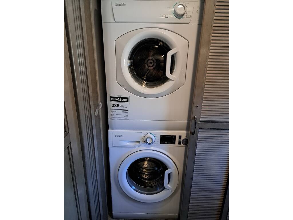 The bedroom offers an Olympic sized queen bed, plenty of storage, including a wardrobe slide. It has a cadet wall mounted heater, a heat pump, a Splendide washer and dryer. The cordless Dyson vacuum cleaner is stored in the wardrobe slide.