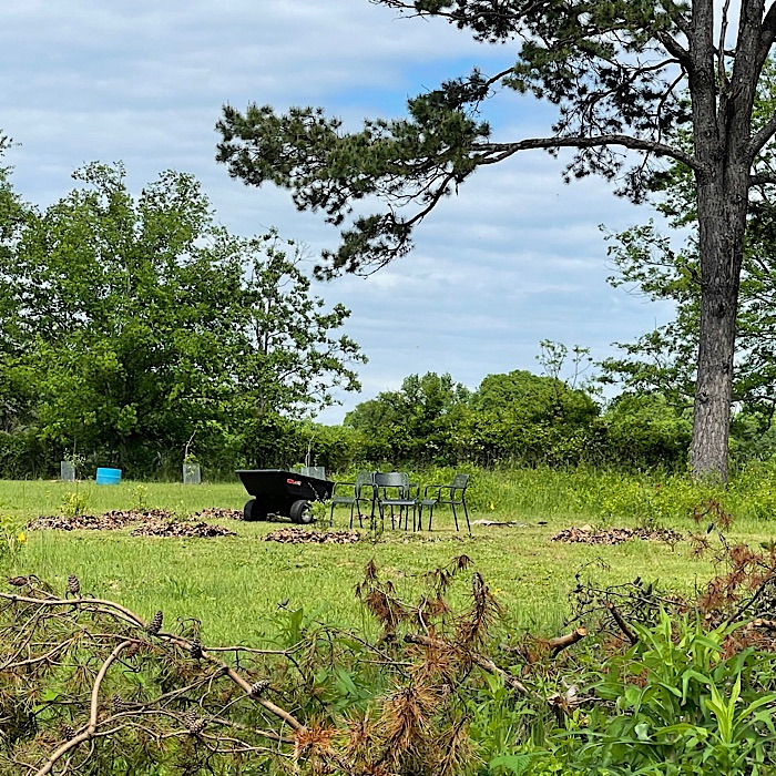 Bruce went and mowed around the pine trees now the poison ivy had been cleared. I finished mulching the blueberries.