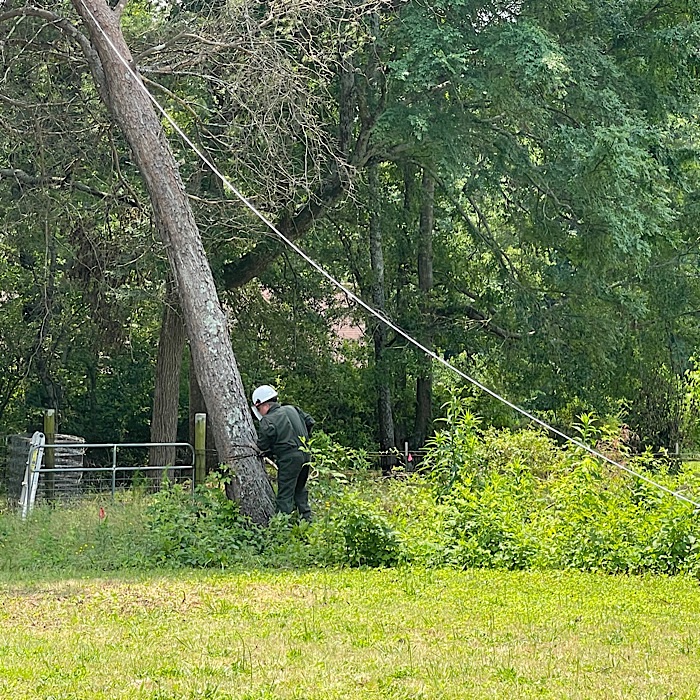 Bruce drove the truck into the back pasture and parked it. Using a ladder, Bruce climbed into the leaning pine tree and wrapped a cable around it.