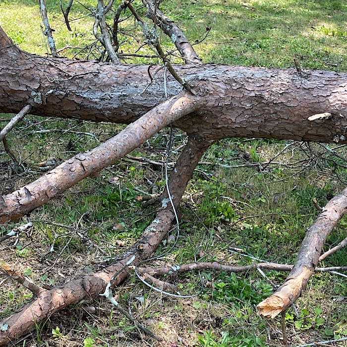 For the back cut, Bruce had me pull the truck forward so the cable was tight. If the tree started to fall, he wanted it to be in a direction that he wasn’t in. He had me pull forward in the truck about three times, keeping the cable tight. Once the back cut was complete, Bruce had me go off to the side, so I could safely watch the process. Bruce climbed into the driver’s seat of the the truck. He pulled the truck forward until pine number one was down.