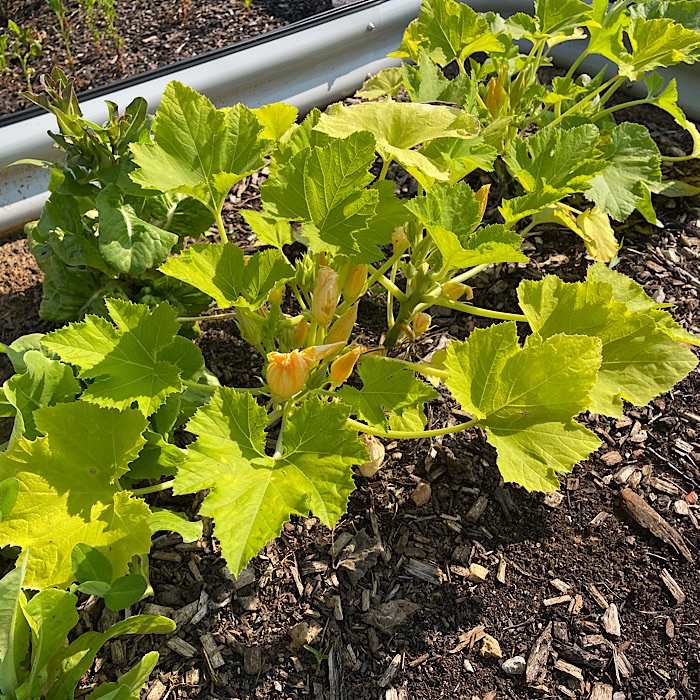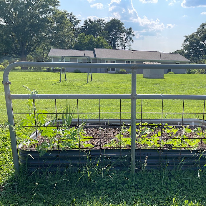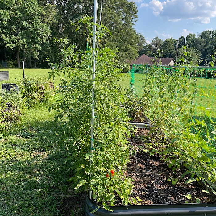 By the time we got back home, the fog had burned off. Bruce went off to mow and I did some gardening. I spent time trying up the tomatoes with Velcro and training the cucumbers and squash on the trellis.