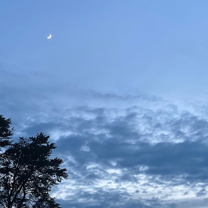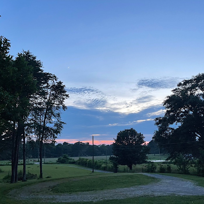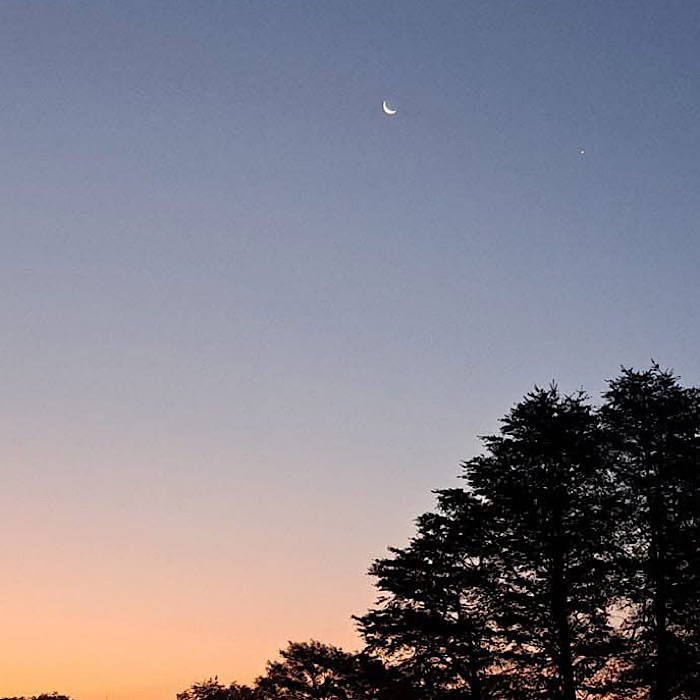 On June 28 (Saturday), Nox got me up just before sunrise to go outside. The moon and Venus were visible just above the yellow orange of the beginning sunrise.