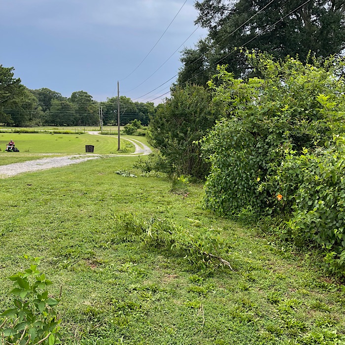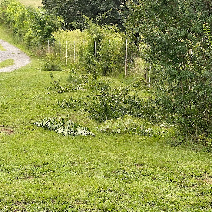 While Bruce mowed, using the loppers, I trimmed trees along the north fence.