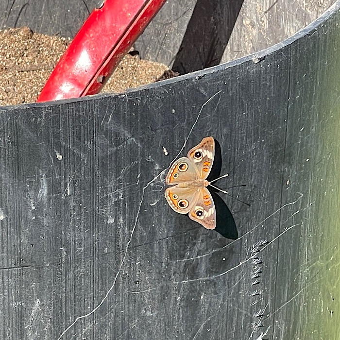 On July 3 (Thursday), I went to get the poop scoop to clean up after Nox’s morning poop stop. I was surprised to discover a Red Admiral butterfly on the poop.