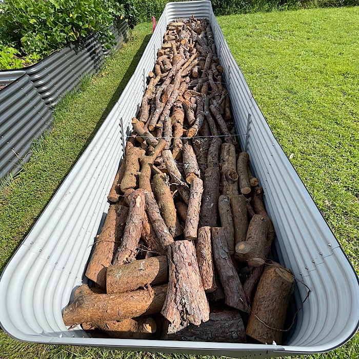 I got up a bit later and headed out to the garden to harvest vegetables and check on the plants. I also wanted to see what Bruce was doing. He was at the new garden bed, putting in logs.