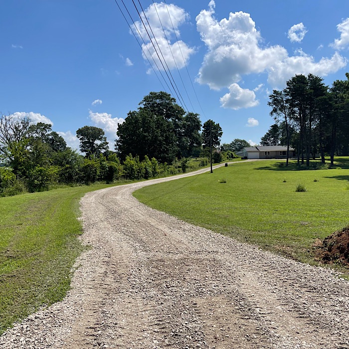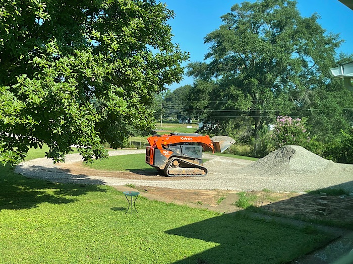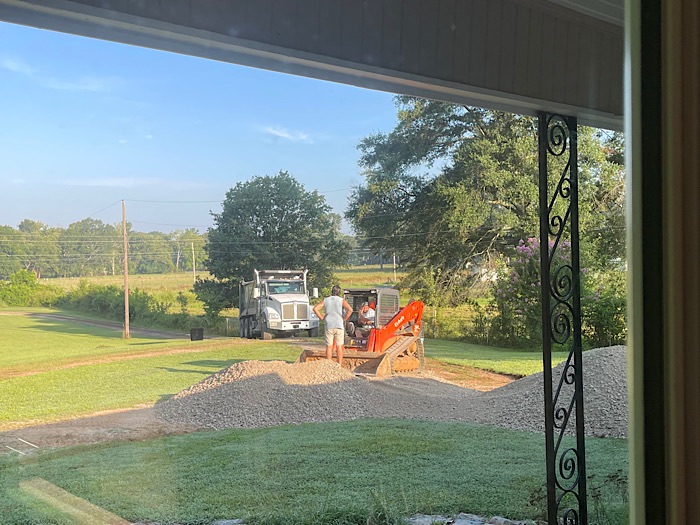 The truck at the bottom of the driveway is bringing in the first load of crusher run gravel, which the driver dropped off in front of the garage.