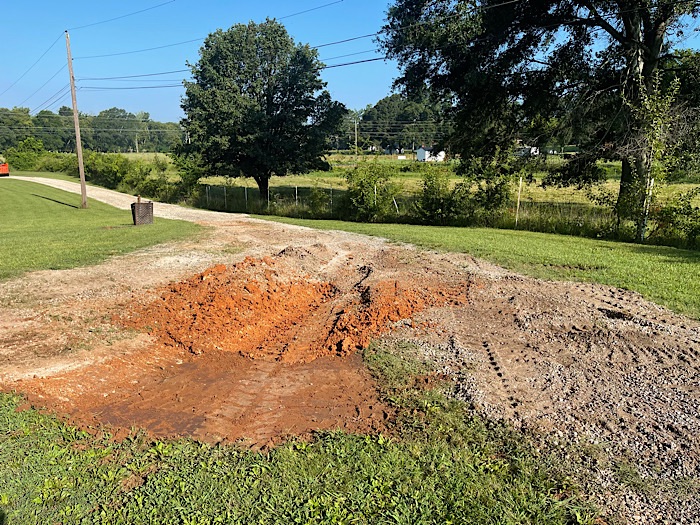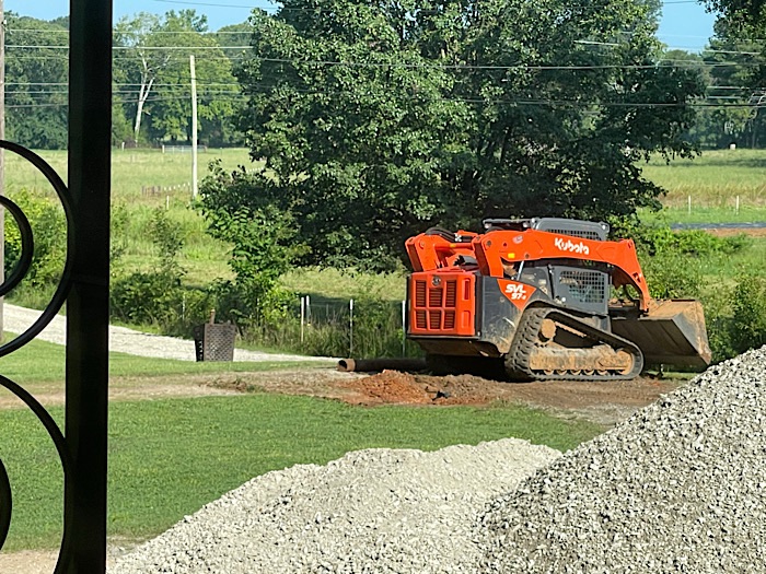 The driveway was completed before 11:00 am! Bruce had them take away the old clogged drainage pipe, since he couldn’t think of a use for the long rusted pipe.