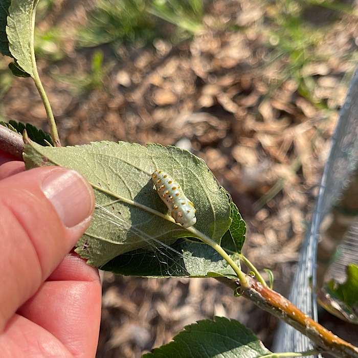 After supper, we walked around the yard. I discovered this Variegated Fritillary chrysalis on one of the apple trees.
