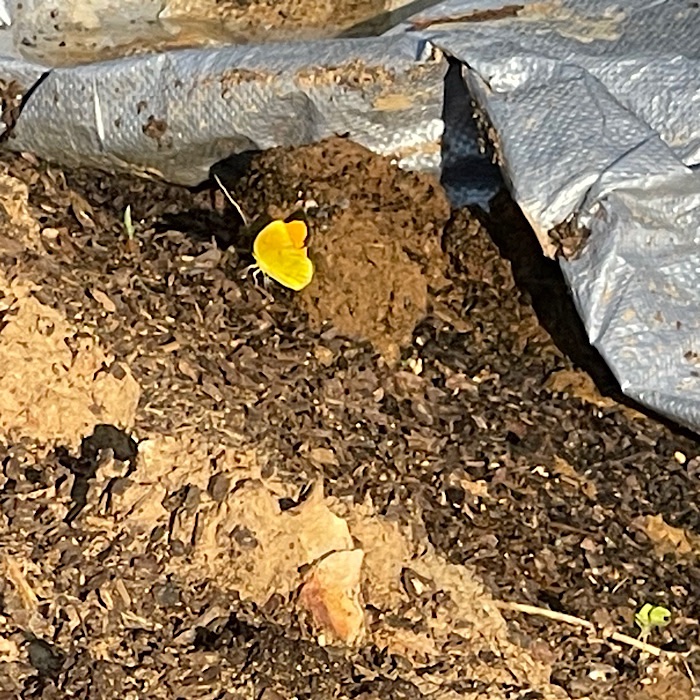 In the late afternoon, I went out to check on the garden. There were so many butterflies at the edge of the Bama Dirt piles. The wet edges provide a safe way for the butterflies to get water. The Sleepy Orange Butterfly’s wings’ upper surface is orange with black borders while the under surface is yellow in the summer form. I was able to get a several pictures of a Sleepy Orange butterfly.