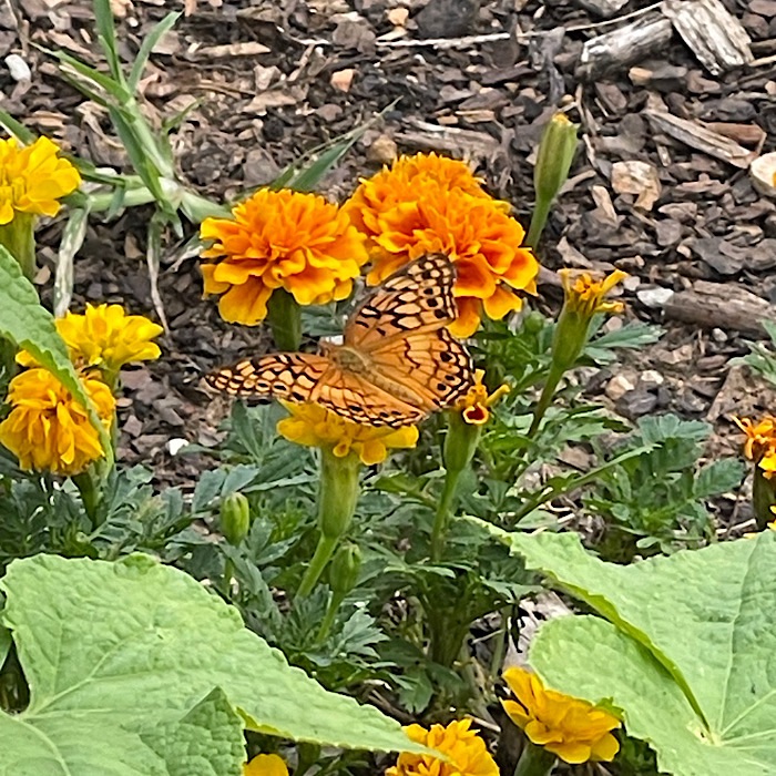 I put the leaves and dirt from the potato growing bins into several of the raised beds as a mulch around the plants. I was able to get some pictures of butterflies on flowers.