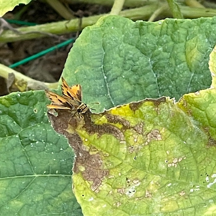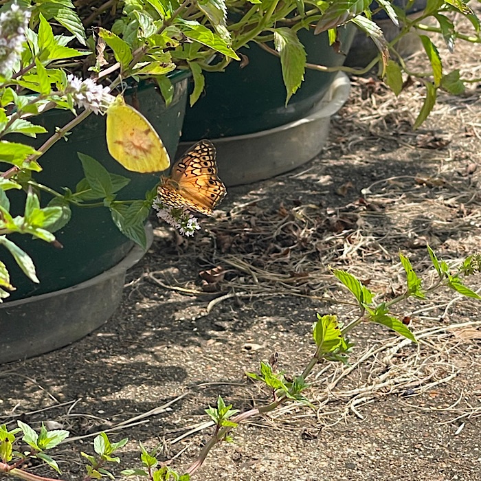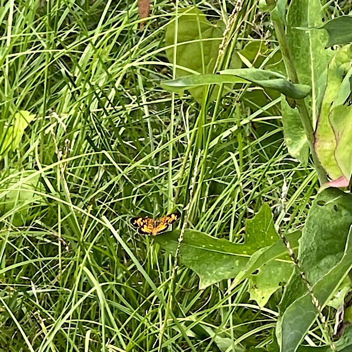 There are so many butterflies in the garden. The Pearl Crescent on the marigold flower had lost most of its rear wings. I was surprised it could still fly.