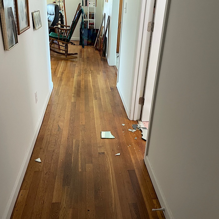 We rushed out to see what had happened! There was broken glass in the hallway!