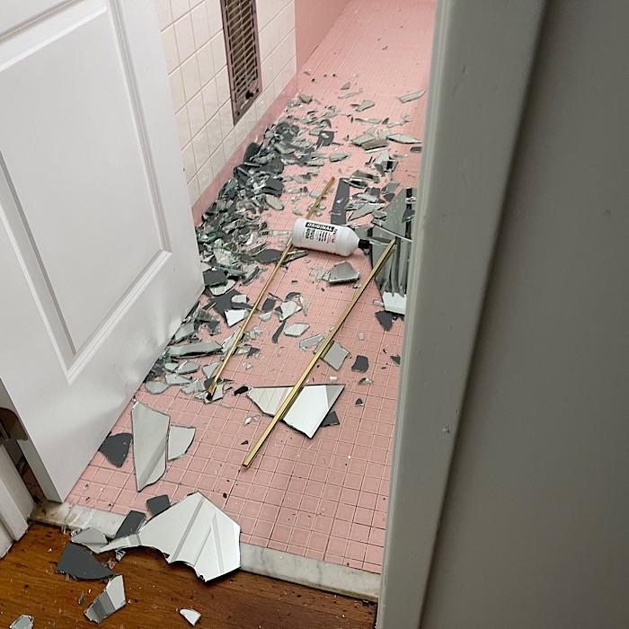 The large bathroom mirror came loose and fell!