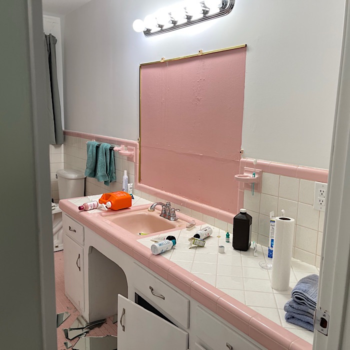 The bathroom is a lot darker without the large mirror.