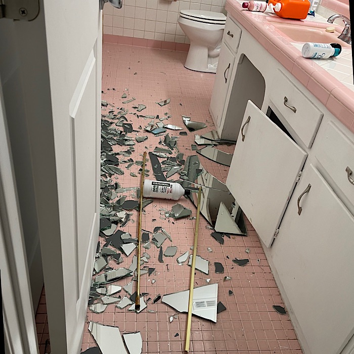 It was a relief it was just the bathroom mirror and not the new beautiful artwork falling and breaking the glass art lamp shade.