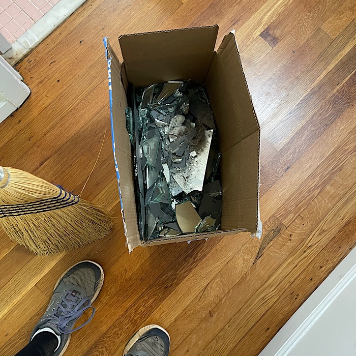 We put the box of broken glass into a contractor’s garage bag.