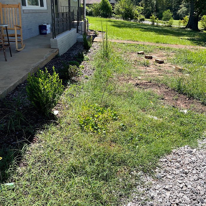 It requires weeding after rainy days. Mike puts salt on the ground which holds back the weeds.