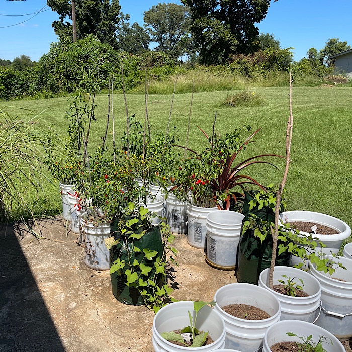 I carried my 5-gallon buckets with pepper plants, eggplants, and lemongrass back outside. While all the plants lived, some had been munched on by the dreaded armyworms.