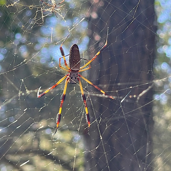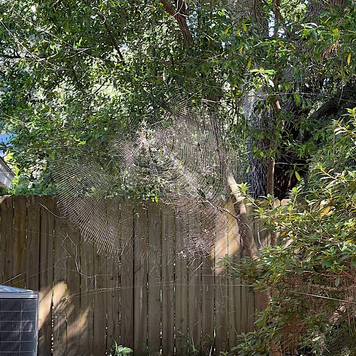 On the side of my father-in-law’s house, Bruce and I discovered a beautiful shimmering spider web.