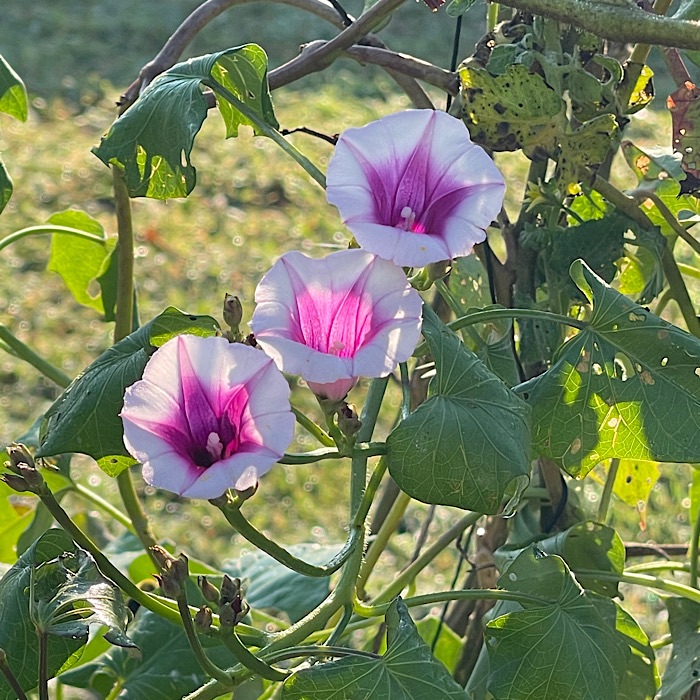 There was one sweet potato vine left in the garden; it was growing up a tomato plant. The sweet potato blooms were beautiful with the sunlight shining through the petals.