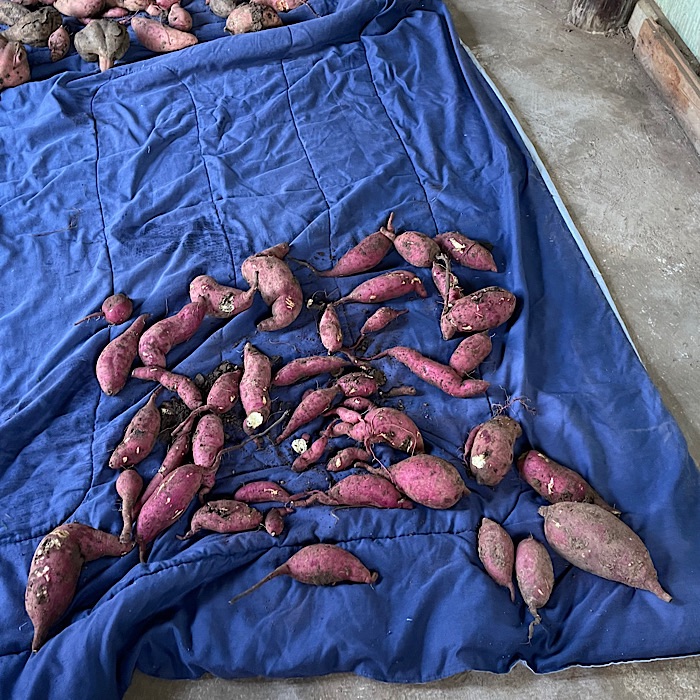 Those sweet potato blossoms are beautiful. You look like you got a pretty good harvest. Do you know why the one bed did not do well?