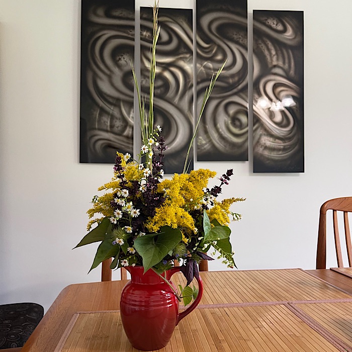 On September 25 (Thursday), I had invited some new friends for lunch. I went out to the garden and the back pasture to pick some foliage and flowers for a flower arrangement. The purple basil (purple leaves and flowers), sweet potatoes vines (heart shaped leaves) with flowers (purple trumpet flowers), goldenrod (yellow flowers), hairy clustervine (small blue flowers), hairy aster (small white flowers), and broom straw for height looked pretty to me, so thatās what I picked.
