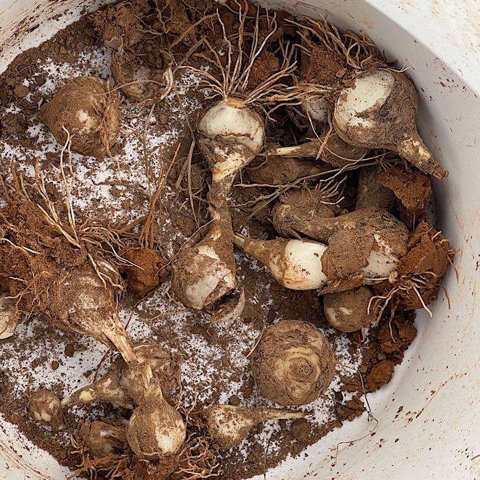 I dug all the flagged daffodils from the islands in the grass. As I dug them up, I placed them in a 5-gallon bucket. I started digging bulbs from the peninsula. When I got close to the blackberry brambles, I called it quits. The canes had reached out and grabbed me, as I tried to dig up some bulbs. Ouch, ouch, ouch! I needed more protection.