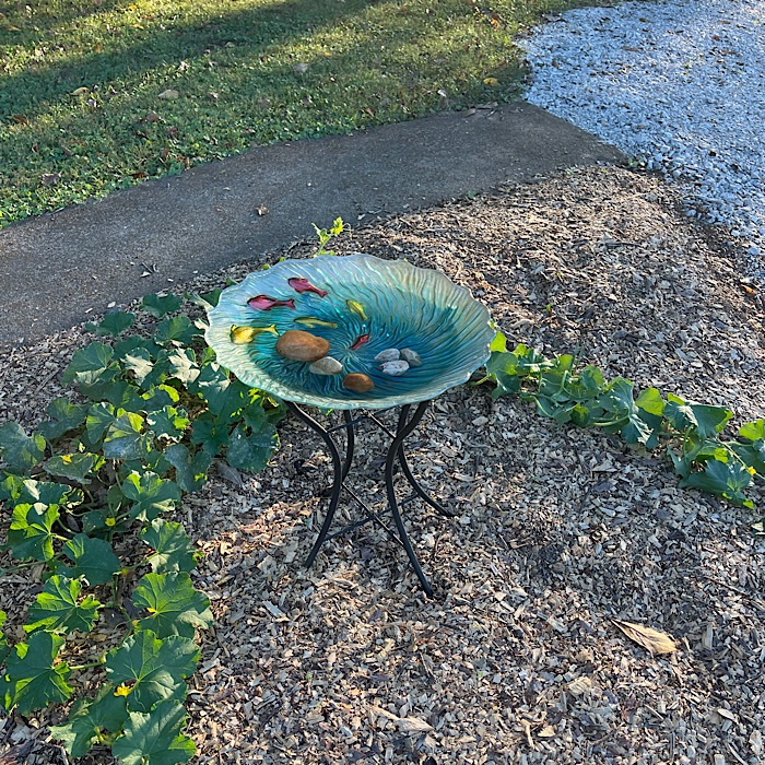Bruce moved the birdbath to the middle of the small flower garden when he mowed. He put it right where I said I wanted it.