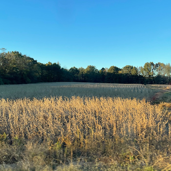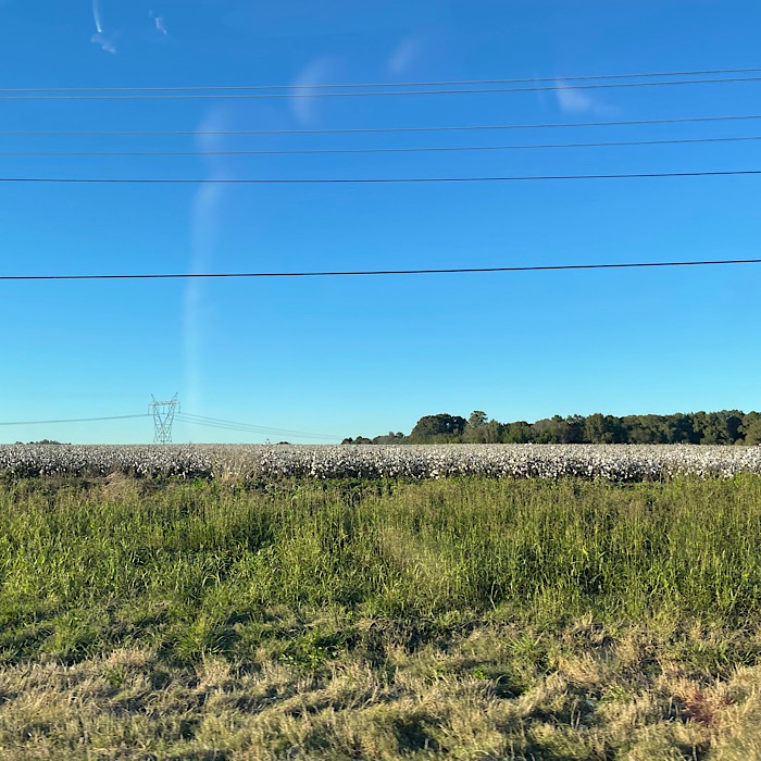 We drove past cotton fields, soybean fields, and corn fields. The harvesting has begun and I saw a lot of harvested fields. In one cotton field, the harvested cotton looked like a round hay bale wrapped in a pink cloth. The ends were white. I hadn’t seen cotton stored that way before.