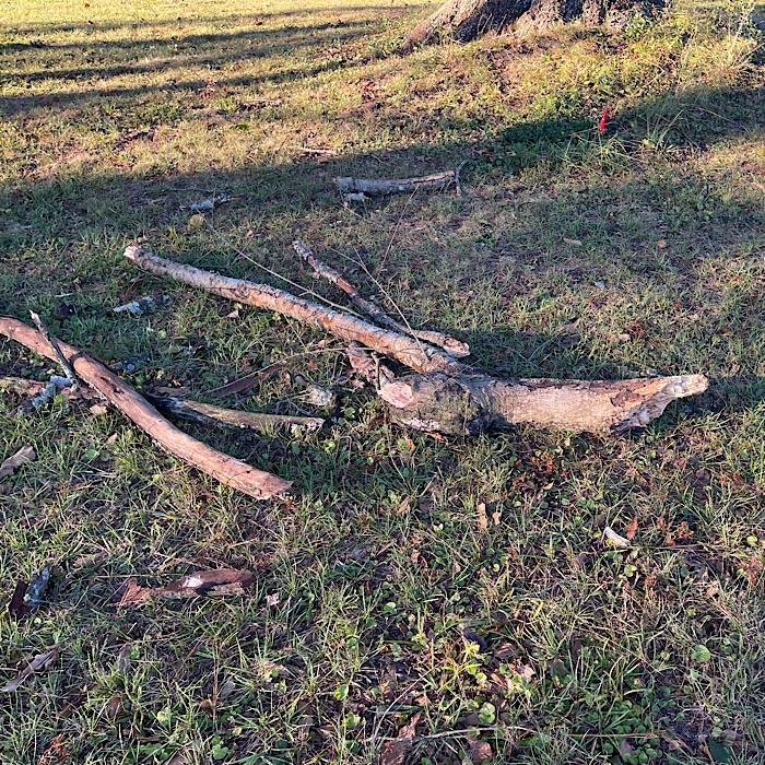 After showing me what he did, Bruce got to work clearing around Pine Tree 2. I moved the smaller branches from around the tree while Bruce moved large logs. I added to the pile of chippable branches for Bruce’s next chipping session. I moved the branches that need additional cutting to the grass around the pile for easy access.