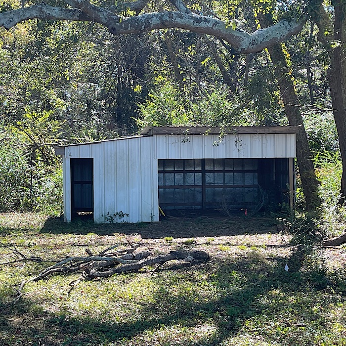 He removed blackberry canes and dead branches from around one of the sheds.