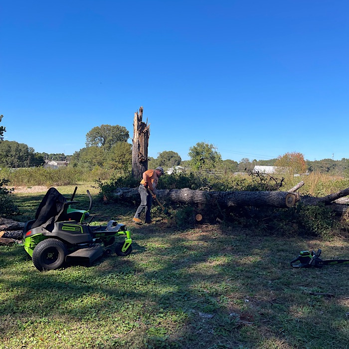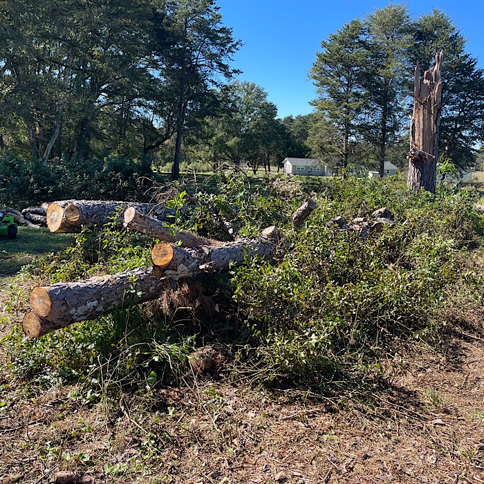 It was nice working in the shade. With the branches and logs cleared away, Bruce was able to mow next to the trunks of Pine Tree 2.